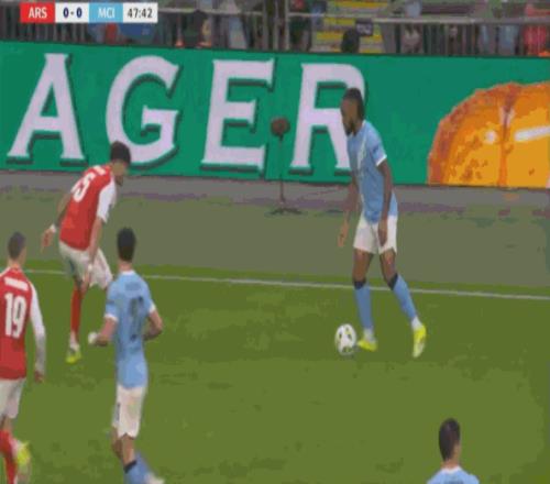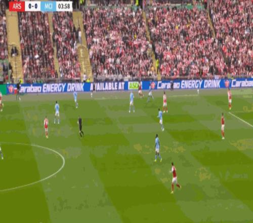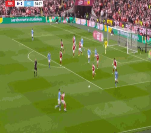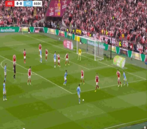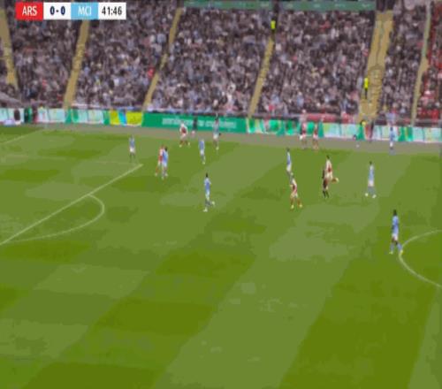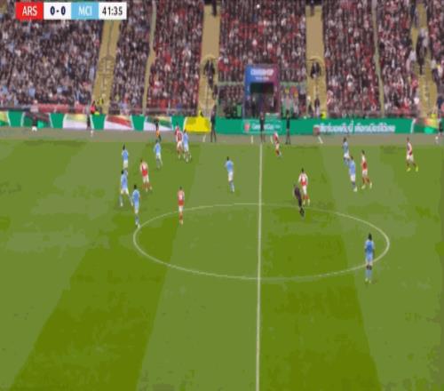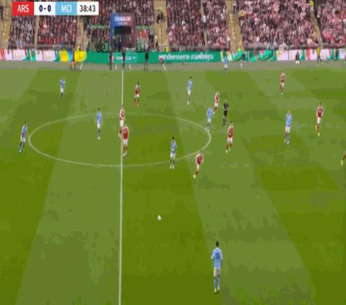 於是隨著時間的推移,實際上已經是曼城越打越好了,比如在第39分鍾,曼城這次先分右邊,把特羅薩德和因卡皮耶都拽過去之後,羅德裏就從哲凱賴什和哈弗茨之間穿出來,在無人區域帶球向前,形成了對阿森納的威脅: