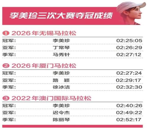 2:25:05,李美珍在第四次無錫交出了最閃亮的成績單。這個成績讓她超越了2024年夏雨雨在名古屋女子馬拉鬆跑出的2:25:45,成為現役女選手的第二。