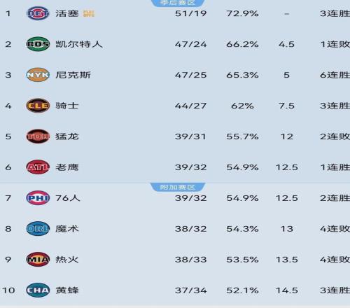當前東部常規賽戰績排在猛龍前麵的球隊,分別是活塞(51-19)、凱爾特人(47-24)、尼克斯(47-25)和騎士(44-27)。