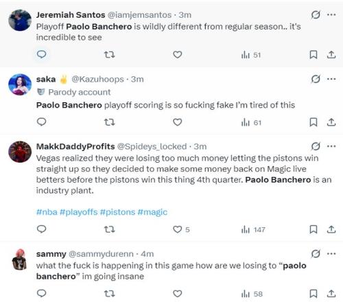 已經有球迷表示,班凱羅季後賽的表現跟他常規賽判若兩人。更有活塞的球迷認為班凱羅季後賽的表現太假了,如果魔術爆冷贏球聯盟應該審查班凱羅。(前三節小瓦格納隻拿到8分都沒人討論他)