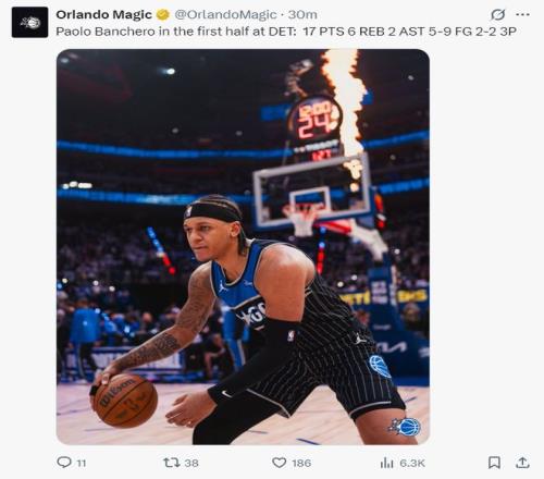 這是一場拉鋸戰,開場魔術就打出15-5,但很快活塞迎頭趕上,班凱羅與坎寧安的狀元對話也非常精彩,首節班凱羅5中3+三分1中1+罰球2中2拿到9分3籃板,上半場打完班凱羅9中5+三分2中2拿到17分6籃板2助攻,他的總體發揮是比CC更出色的。
