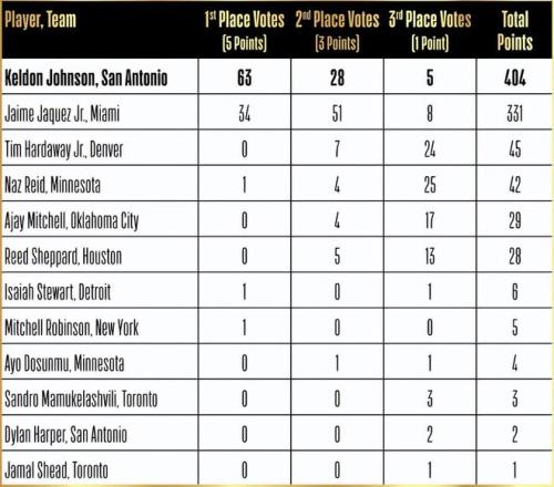 來自NBA官方的消息,馬刺隊鋒衛搖擺人凱爾登約翰遜榮獲2025-26賽季年度最佳第六人!隨後,NBA官方發布了三位最佳關鍵球員得分情況,具體如下:凱爾登約翰遜斬獲了63張第一選票,28張第二選票和5張第三選票,總得分高達404分;哈克斯拿到34張第一選票,51張第二選票和8張第二選票,總得分為331分;小哈達威拿到7張第一選票和24張第三選票,總得分僅為45分。值得一提的是,森林狼隊的裏德(42分)、雷霆隊的米切爾(29分)、火箭隊的謝潑德(28分)、活塞隊的斯圖爾特(6分)、尼克斯隊的米羅(5分)、森林狼隊的道蘇姆(4分)、猛龍隊的馬穆(3分)、馬刺隊的哈珀(2分)和猛龍隊的謝德(1分)分享了剩餘選票。